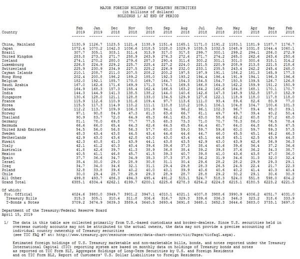 当地时间4月15日,美国财政部公布的数据显示,中国所持美国国债2019年2月环比增长42亿美元,总持有规模为1.1309万亿美元,这是继去年连续5个月减持后第3个月持续攀升。