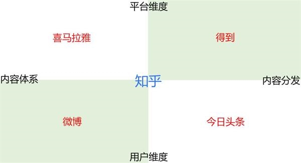 如果从内容分发、内容体系、用户维度、平台维度四个点去展开讨论,会发现知乎的结构非常清晰。再把知乎的竞争对手放进四个象限中,更能找到知乎自身的长短板。