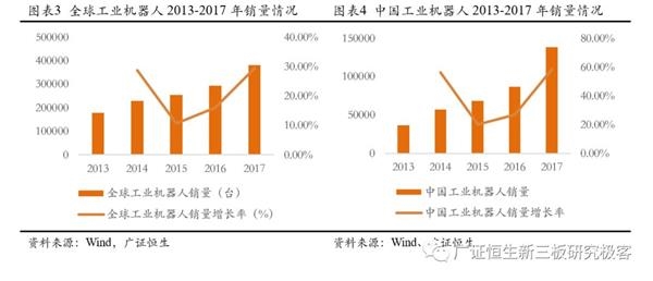 从产业规模上看,目前我国是全球最大的机器人市场。以工业机器人为例,2017年我国工业机器人销量占据全球销量的三分之一左右,远超美国、欧洲等地;工业机器人销量增速在2017年达到惊人的58.53%。销量惊人的背后是机器人需求端,如3C电子、汽车行业等产业的快速发展以及应对人口红利退坡。