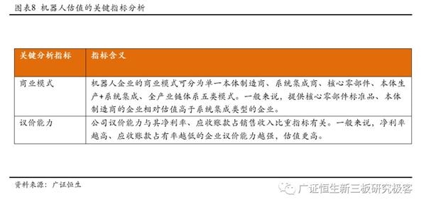 估值反映的是一家公司最终是业绩增长情况。企业价值评估是将一个企业作为一个有机整体,依据其拥有或占有的全部资产状况和整体获利能力,充分考虑影响企业获利能力的各种因素,结合企业所处的宏观经济环境及行业背景,对企业整体公允市场价值进行的综合性评估。不同类型的企业反映业绩增长的因素不同,对于机器人行业来说,业绩增长与行业空间、产品议价能力、商业模式等因素有关。