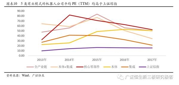 同一行业处于不同产业链,企业的估值有着明显的差别。对于机器人行业来说,机器人企业的商业模式可分为单一本体制造商、系统集成商、核心零部件、本体生产+系统集成、全产业链体系五种模式。核心零部件商业模式的企业估值更高。