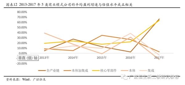 剔除无近五年历史数据的公司、PE(TTM)为负以及极端数值的公司,最终选取18家公司数据作为样本进行最终验证。通过对18家公司进行商业模式划分,并计算出5类商业模式公司2013-2017年的平均PE(TTM)。