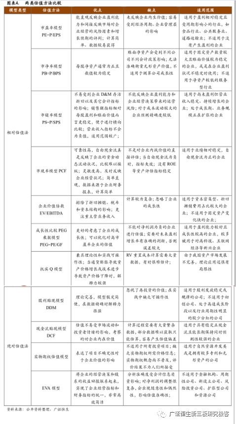 公司估值方法分为两类:相对估值法和绝对估值法。相对估值法包括市盈率模型、市净率模型、市销率模型、企业价值倍数、成长性比较PEG乘数模型以及托宾Q模型等;绝对估值法包括股利贴现模型、现金流贴现模型、实物期权模型以及EVA模型等。