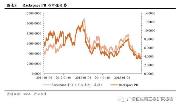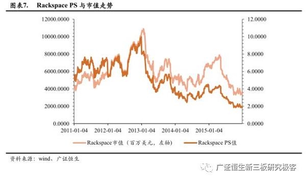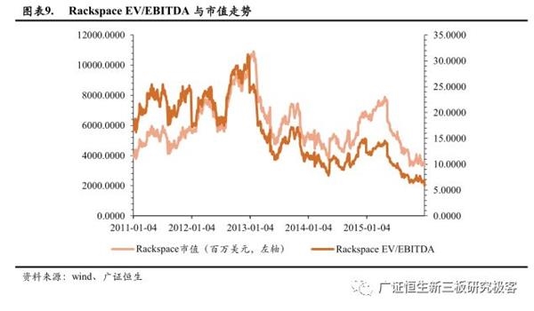 Rackspace PS在1.8-10.0X之间,PB在3.4-12.1X之间,EV/EBITDA在5.8-31.3X之间。Rackspace是IaaS领域的领导者,因此我们选取Rackspace看美股IaaS估值倍数。Rackspace PS与PB相对稳定,PS与PB值均于2012年12月31日达到最大值9.9840、12.1310,之后逐渐下降,直至2015年10月21日的最低值1.8450、3.4197;EV/EBITDA则波动较大,于2012年12月20日达到最大值31.2625,之后逐渐下降,于2015年12月31日达到最低值5.8148。