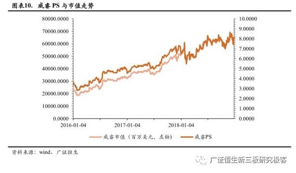 威睿是虚拟化和云基础架构解决方案提供的领导者,美国公共云很大一部分厂商均依赖威睿公司,因此我们选取威睿来看美股虚拟化企业PS估值情况。威睿PS值随着市值不断上升,2016年2月2日其PS值处于最低点2.8389,于2018年11月30日达到最高点8.6583。