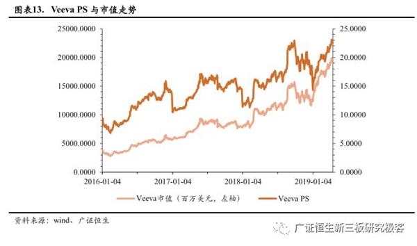 垂直SaaS企业我们选取Veeva,因为Veeva拥有超过300家企业客户,其中包含世界最大的制药集团,是生命科学行业领先的垂直SaaS企业。其PS值相对通用SaaS企业来说波动更大,其PS最低值为2016年2月15日的6.7944,最大值为2019年4月10日的23.0895。