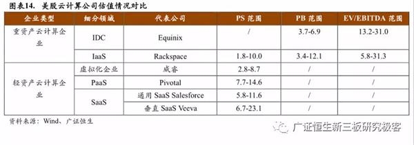 综上,美股重资产云计算分为IDC企业和IaaS企业,IDC企业常用PB和EV/EBITDA估值,而IaaS企业在基础设施投入期与IDC企业类似,通常用PB和EV/EBITDA估值,在业务快速发展期则用PS估值;轻资产云计算企业则分为虚拟化企业、PaaS企业、SaaS企业(包括通用SaaS和垂直SaaS),通常用PS估值。