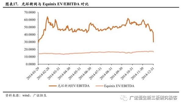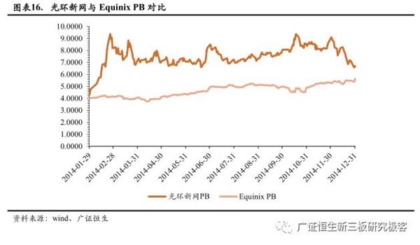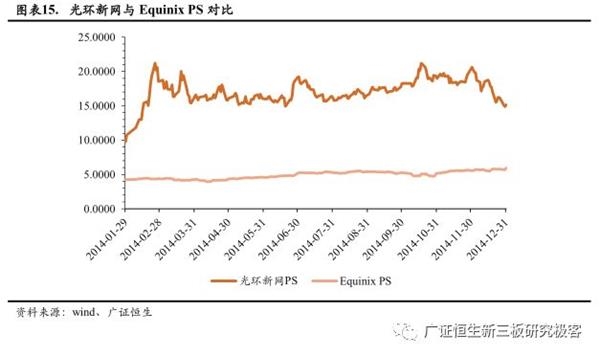光环新网2014-2015年主营IDC业务,同时14年的主要收入来源IDC及其增值业务与Equinix业务较相近,因此我们选取两家2014年的数据进行对比,判断国内IDC企业适用估值方法。