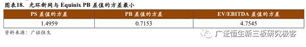 进一步地,我们计算两家企业三类估值方法的差值的方差,以此来判断国内IDC企业最适宜的估值方法。通过计算,两家企业PS差值的方差为1.4959,PB差值方差为0.7153,EV/EBITDA差值方差为4.7545,可以看出PB差值的方差最小,这说明考虑国内市场相对美股市场的溢价后,光环新网与Equinix的PB值最为接近,证明PB估值对于国内与美股的IDC企业均具有适用性,而科创板制度上与美股类似,但仍处国内环境,因此对于科创板的IDC企业来说,PB是适宜的估值方法。