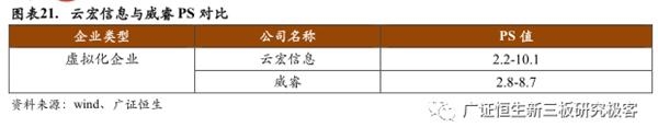 国内的虚拟化企业中,我们选取数据较为充足的云宏信息与威睿进行对比,云宏信息2016年-2018年PS于2016年4月18日达到最大值10.0554,之后随着市值不断下降,于2018年11月22日降至最低点2.2286,其PS波动区间2.2-10.1X与威睿PS所处范围2.8-8.7X相差不大,验证了虚拟化企业PS估值的适用性。