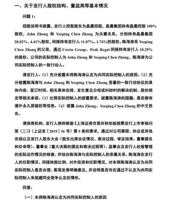 一般而言,首个问题往往是监管层较为关心的问题。晶晨半导体的第一个问题,监管层主要关注实际控制人的认定上,直击控制权。