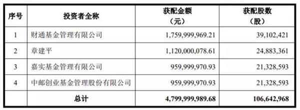 2016年7月,乐视网进行了上市以来最大也是最后一次非公开发行操作。公司以45.01元/股的价格,向财通基金、章建平、嘉实基金和中邮创业基金定向发行了1.07亿股股份,合计募资总额近48亿元,锁定期12个月。