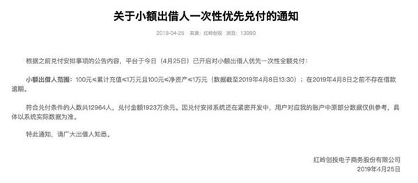 南都深圳大件事记者从红岭创投官方获悉,今日(4月25日)该平台开启对“小额出借人”优先一次性全额兑付,目前符合兑付条件的人数共12964人,兑付金额1923万余元。这等于人均还款一千多元。