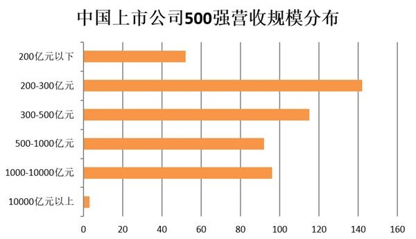 同时,有96家上市公司营收在1000-10000亿元,92家上市公司的营收在500-1000亿元,115家上市公司营收在300-500亿元之间,142家公司营收在200-300亿元,营收在200亿元以下的公司则有52家。