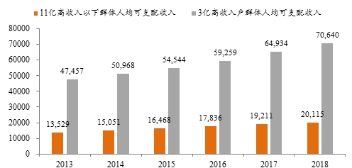 收入的分化必然影响到消费的分化,这也是为何去年大家对于究竟是消费降级还是消费升级争论不休的原因。但事实上,2018年高收入组的人均可支配收入增长率是其他组均值的近两倍。