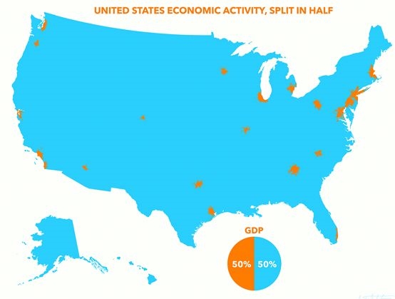 美国就是一个很好的案例,据美国统计部门的数据,美国一半的GDP是由星星点点的橙色区域创造的。