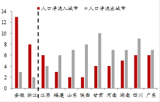分行政区域看,2018年除了浙江、安徽和江苏三省的人口净流入城市数量大于净流出之外,其他省的人口净流出城市的数量均大于净流入城市的数量,连人口净流入量最大的广东省也不例外。
