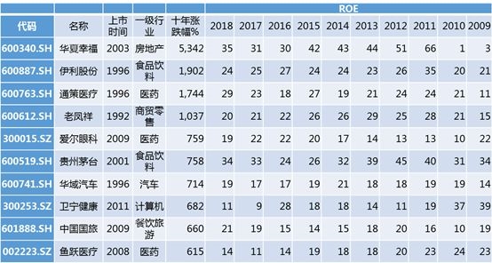 从这些公司的股价表现来看:涨幅大的,其ROE都比较高,或ROE提升非常明显;股价表现较差的,其ROE改善不明显,净利增长主要靠规模横向扩张。从2008年底到2019年3月底,这38家公司中10年涨幅超过10倍的有7家,分别为:华夏幸福、通策医疗、伊利股份、贵州茅台、立讯精密、老凤祥和爱尔眼科。
