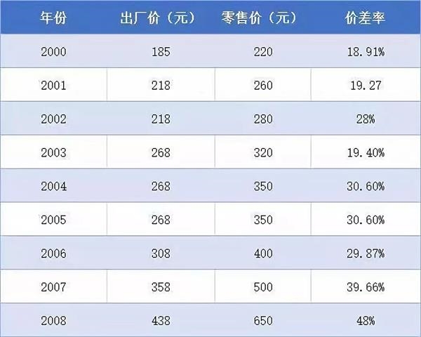 据公开信息,以53度飞天茅台为例。2000年,该酒的出厂价为185元,零售价约为220元,价差率为18.91%。2001年8月,该酒出厂价提高18%,为218元,零售价为260元,价差率上升至19.27%。2002年,出厂价未涨,为218元,但零售指导价上调至280元,价差率提升至28%。。。2007年3月1日,出厂价提高16%,为358元,零售价提高至500元,价差率提升至39.66%;2008年,出厂价提高22%至438元,零售价也提高至650元,价差率提高至48%。