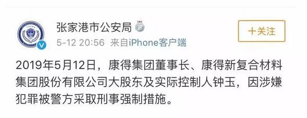 “张家港市公安局”此前发布消息称,2019年5月12日,康得集团董事长、康得新复合材料集团股份有限公司大股东及实际控制人钟玉,因涉嫌犯罪被警方采取刑事强制措施。