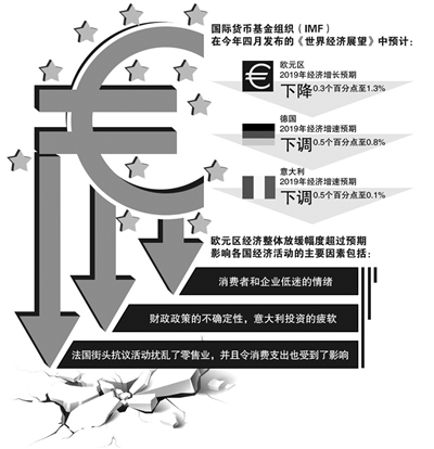 国际货币基金组织(IMF)在今年4月发布的《世界经济展望》中,将欧元区2019年经济增长预期下调0.3个百分点,至1.3%。而德国、法国以及意大利的2019年经济增速预期也遭遇不同程度的下调。德国和意大利下调幅度最大,分别下调0.5个百分点至0.8%和0.1%。