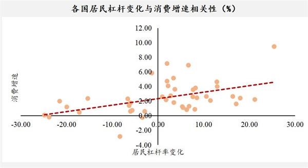 事实上,统计了个主要经济体国家和地区的居民杠杆率与消费增速之间的关系,发现的确也存在一定的正相关性。