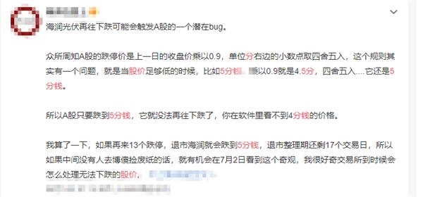 在股价连续跌停之时,有投资者却提出到了一个问题,如果退市海润继续连续大跌,可能会触发A股的一个潜在bug。