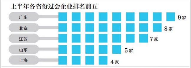 地域方面,2018年,按闯关IPO的数量排列,江苏、浙江、广东、上海、北京、山东、湖北和四川分别以22家、20家、17家、9家、7家、6家、6家和4家位居前列,今年上半年,广东取代江苏,成为过会企业最多的省份,具体是广东、北京、江苏、山东、上海、四川、浙江分别有9家、8家、7家、5家、4家、4家和4家企业成功过会。