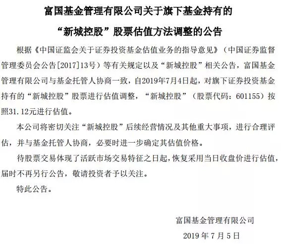富国基金7月4日晚间公告显示,关于旗下基金持有的 “新城控股”股票估值方法调整的公告显示,根据《中国证监会关于证券投资基金估值业务的指导意见》等有关规定以及“新城控股”相关公告,富国基金管理有限公司与基金托管人协商一致,自2019年7月4日起,对旗下证券投资基金持有的“新城控股”股票进行估值调整,“新城控股”(股票代码:601155)按照31.12元进行估值。