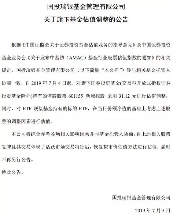 国投瑞银公告显示,自2019年7月4日起,对旗下证券投资基金持有的停牌股票 601155 新城控股采用31.12元进行估值调整;同时,对ETF联接基金持有的标的ETF,在当日份额净值的基础上考虑上述股票的调整因素进行估值。