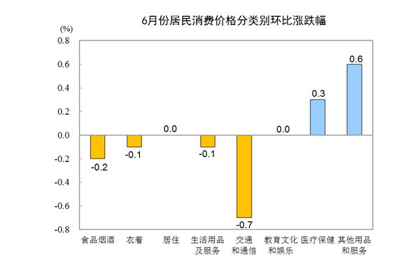 6月份,全国居民消费价格环比下降0.1%。其中,城市下降0.1%,农村下降0.2%;食品价格下降0.3%,非食品价格下降0.1%;消费品价格下降0.2%,服务价格上涨0.1%。