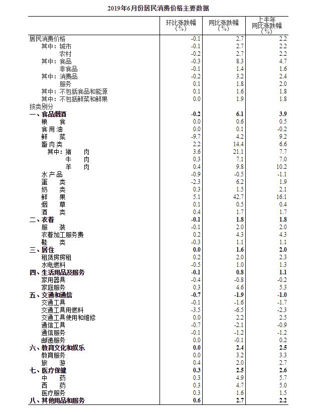 2019年6月份,全国居民消费价格同比上涨2.7%。其中,城市和农村均上涨2.7%;食品价格上涨8.3%,非食品价格上涨1.4%;消费品价格上涨3.2%,服务价格上涨1.8%。上半年,全国居民消费价格比去年同期上涨2.2%。