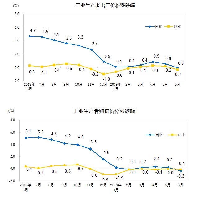 2019年6月份,全国工业生产者出厂价格同比持平,环比下降0.3%;工业生产者购进价格同比下降0.3%,环比下降0.1%。上半年,工业生产者出厂价格比去年同期上涨0.3%,工业生产者购进价格上涨0.1%。