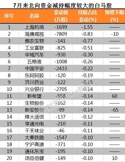 而值得注意的是,东方财富Choice数据显示,对于白马龙头股,7月以来北向资金却进行了大幅减持,7月以来,有20股持股占流通股比例减少0.1%。