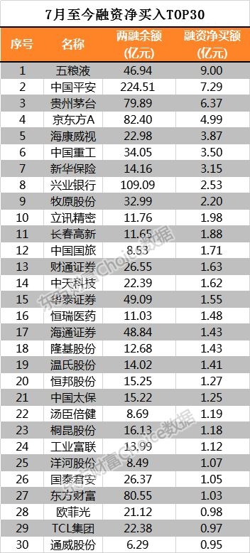 而令人意外的是,7月以来,两融资金却积极增仓白马股,在融资净买入最多的30只个股中,五粮液以愈9亿的净买额高居榜首!其次是中国平安、贵州茅台、京东方A、海康威视等个股,也分别获得7.29亿元、6.37亿元 、4.99亿元 、3.87亿元的净买入额。