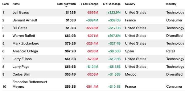 至于亚马逊创始人、世界首富贝索斯,他的净资产今年略微上涨至1250亿美元,在与妻子麦肯齐离婚后,麦肯齐成为世界上第四富有的女性。