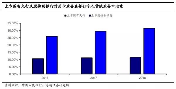 信用卡业务在银行个人贷款业务中比重升高。以上市国有大行及股份制银行为例,近三年信用卡业务比重呈现上升趋势,截至18年末,上市国有大行信用卡业务在总体个人贷款业务中比重为11.6%,较上一年末增加了0.4个百分点,上市股份制银行信用卡业务在个贷业务中比重为31.5%,较上一年末增加了1.96个百分点。