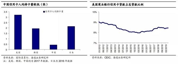 国际比较看,我国信用卡人均持卡量和整体贷款规模都比较低。据国际清算银行的数据,2017年底我国信用卡人均持卡量为0.42张,而美国已达3.21张,韩国也有1.93张,日本这一数据在2016年已经达到2.14张。