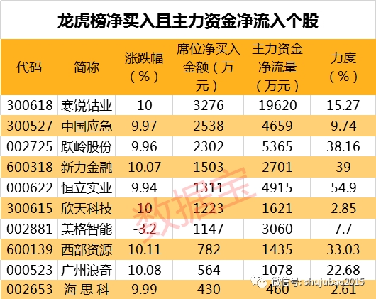 8月8日龙虎榜中机构及营业部席位资金净买入0.64亿元,其中净买入的个股有13只;净卖出的个股有13只。净买入前三名个股分别是寒锐钴业、齐心集团、中国应急等,净买入金额占当日成交额比例达2.55%、12.75%、5.3%。
