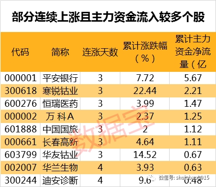 值得注意的是,65只连续上涨个股中,6只个股期间主力资金累计净流入超过亿元。其中,累计资金流入最多的为平安银行,主力资金累计流入5.67亿元。