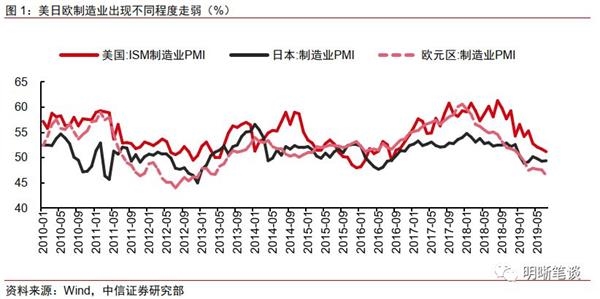 次贷危机后日本和欧元区在QE刺激下复苏仍然相对乏力,透支需求后经济走弱势在必行。本轮经济周期始于次贷危机后的复苏。从发达市场来看,美国经济在过去10年表现强势,而日本和欧元区的复苏进程则相对缓慢。日本经济饱受需求不足和低通胀之苦,长期不温不火,欧元区则经历了次贷危机和主权债务危机的双重打击,2016年以前一直表现不佳。尽管日本和欧元区持续大规模的QE刺激带来了2016年以后经济快速复苏,但是随着货币政策力度下降,以及英国脱欧事件的发酵,市场对基本面的预期越来越差,产能过剩和需求不足的矛盾再次暴露,发达经济体制造业生产和投资均有明显走弱。其中,欧元区制造业PMI自去年年初触顶,年底美国制造业也开始明显回落。
