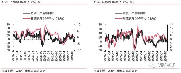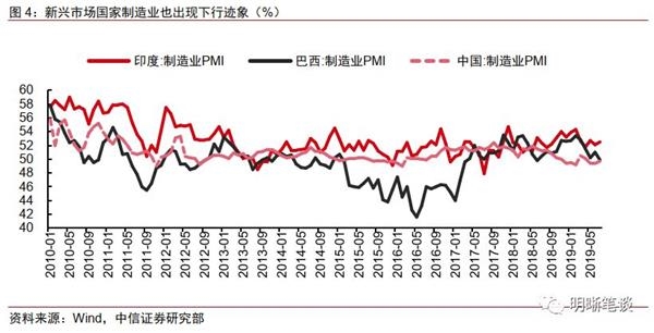 中国和发达国家需求趋弱传导至新兴市场国家,全球经济进入下行周期。随着全球经济逐渐形成一个整体,中国和发达市场的经济波动对新兴市场的影响也日益显著。新兴市场经济体的GDP受出口影响较大,以印度和巴西为例,GDP同比增速与出口同比增速在大部分时间里高度相关。随着美国经济今年二季度见顶回落,日本和欧元区的需求不断下滑,中国受到金融去杠杆影响经济下行压力较大,新兴市场国家的制造业也开始受到较为明显的拖累。我们看到,作为新兴市场国家的印度和巴西,制造业PMI在今年2月份上行至阶段性高点,随后开始掉头向下。