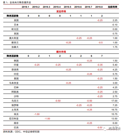 中国和发达国家需求趋弱传导至新兴市场国家,全球经济进入下行周期,全球央行开启降息潮。次贷危机后日本和欧元区在QE刺激下复苏仍然相对乏力,透支需求后经济走弱势在必行。中国和发达市场的经济波动传导至新兴市场,全球经济进入下行周期。美联储6月的鸽派指引和7月的降息行为引领全球央行降息潮,全球利率下行,为中国央行降息打开空间。