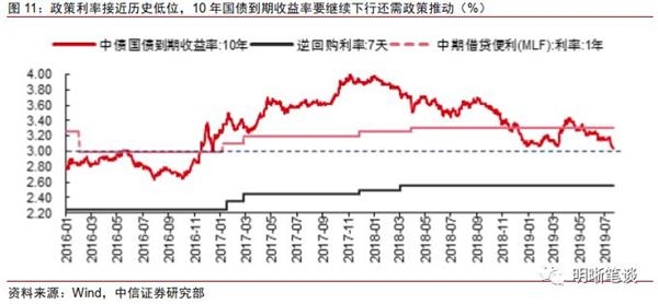 2019年以来引导利率的核心因素从货币政策转向经济基本面,全球降息周期、国内经济基本面的长期压力使得市场风险偏好继续走向保守,成为利率下行的推动力。而另一方面,一季度信贷抢先投放提前透支了信贷需求,而票据冲量、票据利率进入“1时代”也体现了目前信贷需求的不足,银行风险偏好降低转而更多寻求优质资产造成的“资产荒”局面也维持了利率下行大趋势。我们认为长期来看利率已经存在下行突破3%的空间,我们将10年期国债到期收益率中枢区间下调为2.8%~3.2%。