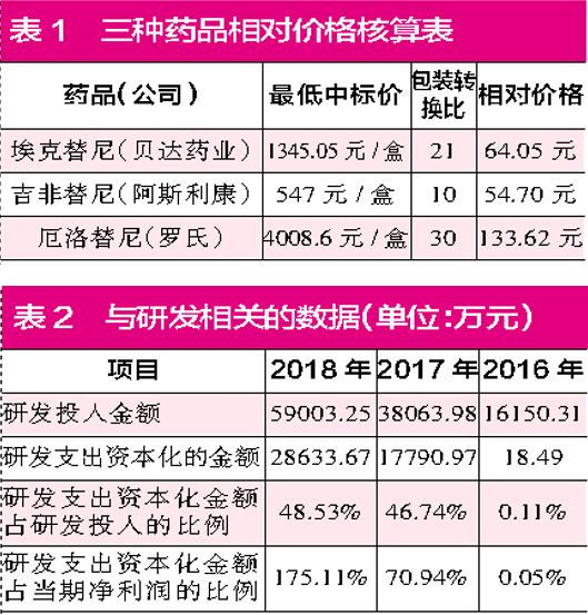 研发支出资本化的“好处”之一是可以降低公司在当期的费用支出,从而美化净利润指标。2014年、2015年、2016年贝达药业研发支出资本化金额占当期净利润的比例分别为1.17%、0.76%、0.05%,而在2017年和2018年,这一比例分别为70.94%和175.11%。其中2018年甚至出现了研发支出资本化的金额超过公司归母净利润的情况。也就是说,如果贝达药业2018年的研发支出按照此前较低的比例进行会计处理,则其当年业绩可能出现亏损。至于贝达药业为何改变一贯的会计处理政策,连续两年大比例资本化研发投入,到底是其研发进入实质阶段,即将推出研发成果,还是其在有意美化净利润?该公司就有必要对此作出合理的解释。