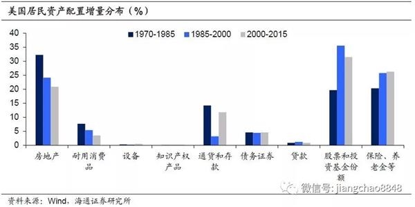 美国的居民资产配置结构经历过从地产到金融资产的转变。从美国居民资产配置增量来看,居民新增资产配置到房地产的比重持续下降,从1970-1985年间的32.3%降至2000-2015年的20.9%。与此同时,股票、基金、保险以及养老金的配置占比逐步扩大,特别是80年代前后出现了明显上升。股票和投资基金的占比从1975-1985年间的19.7%上升至1985-2000年的35.6%,保险、养老金的占比也从20.4%上升至25.8%。也就是说,80年代前后美国居民在资产配置的选择上发生了明显的变化,从房产逐渐偏向于股票、基金等金融资产。