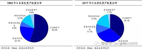 90年代以来,日本居民的资产配置偏好从房地产转向金融资产。1994年日本居民配置非金融资产的占比为55.2%,其中大部分为房地产资产,而2017年这一占比较94年大降19个百分点,仅36.1%,非金融资产规模减少440万亿日元。与之相对,1994年到2017年,居民大幅增配金融资产,其中,现金与存款比重提升10.4个百分点,规模增加了362万亿日元,此外,股票与投资基金比重提升5.5个百分点,规模增加了178万亿日元,而保险与养老金比重提升5.0个百分点,规模增加了177万亿日元。
