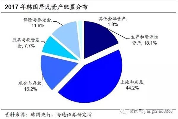 韩国居民财富中配置的非金融资产高于金融资产,其中房地产配置比重约四成。2017年,韩国居民非金融资产的配置占比为62.3%,其中的土地与房屋占比高达44.2%。而金融资产中,韩国居民偏好低风险资产,持有的现金与存款和保险类资产占比分别为16.2%和11.9%。总体来看,韩国居民资产配置与我国相似,房地产资产配置比例较高,低风险资产配置比例较高。