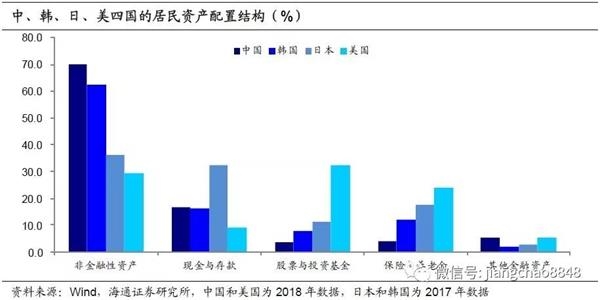 其他国家居民的财富配置。美国:金融资产占七成,多为股票和保险。2018年美国居民资产超过七成为金融资产,居民财富中,股票和投资基金占32%,保险与养老金占23%,而房地产仅占24%。80年代前后,美国居民在资产配置选择上发生明显变化,从房产逐渐转向股票、基金等金融资产。80年代美股进入了一轮长牛,股价上涨使居民原本持有的资产升值,而赚钱效应更吸引资金入市带来新增配置。日本:地产占比降低,青睐低风险资产。目前日本居民也配置了超过六成的金融资产,其中有一半为现金与存款。90年代以来,日本居民的资产配置偏好从房地产转向金融资产。房价下跌使得居民非金融资产大幅缩水、并减少新增配置,同时日本股市震荡下跌,叠加长期低通胀甚至通缩环境,导致居民更青睐低风险资产,17年居民财富中现金和存款的比重比94年高10个百分点,近年日本股市有所回升,居民配置的股票和投资基金占比也相应提高。韩国:房地产配置仍高,与高房价有关。韩国居民财富中配置的非金融资产比重高于金融资产,其中房地产配置比重约四成。居民持有土地与房屋资产占比较高,与韩国房价持续上涨有关,2000年以来韩国房价持续上涨,到今年已翻了一倍。