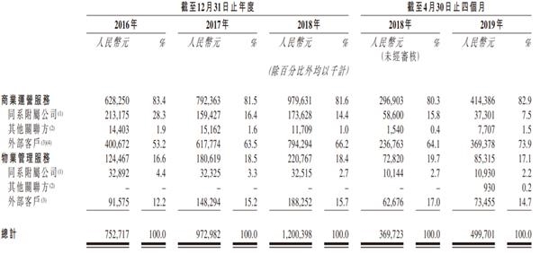 财务数据显示,2016年至2018年及2019年前4月,宝龙商业管理公司的收入分别是7.52亿元、9.73亿元、12亿元、5亿元;期内利润分别是6293.7万元、7859.2万元、1.33亿元、5488万元。于2016年、2017年及2018年及截至2019年4月30日止四个月,向五大客户提供服务所得收入分别为269.9百万元、233.8百万元、246.4百万元及人民币60.9百万元,分别占我们总收入的约35.9%、24%、20.5%及12.2%。